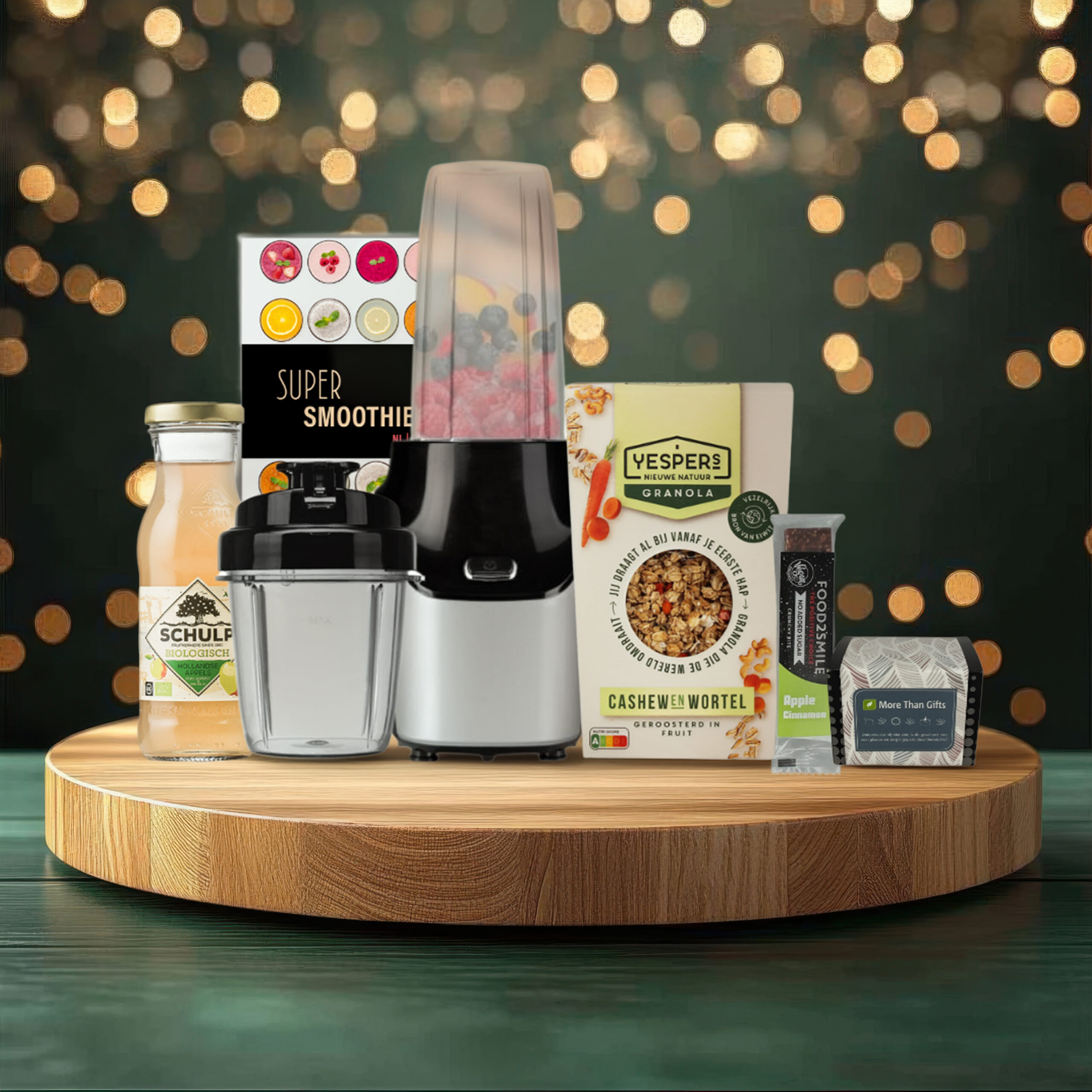 Mix je eigen smoothies met de handige blender, ontdek nieuwe smaken met het Super Smoothies boekje en geniet van pure producten zoals biologische appelsap, granola en de feestelijke ApplePie bar. Een verfrissend geschenk dat energie geeft én een glimlach brengt.